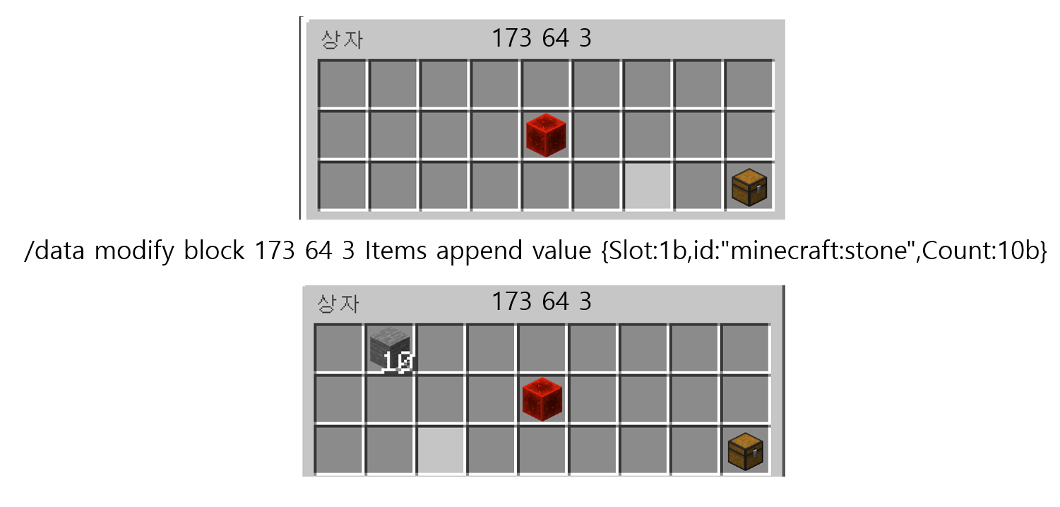 - 예시 : /data modify block 173 64 3 Items append value {Slot:1b,id:"minecraft:stone",Count:10b}