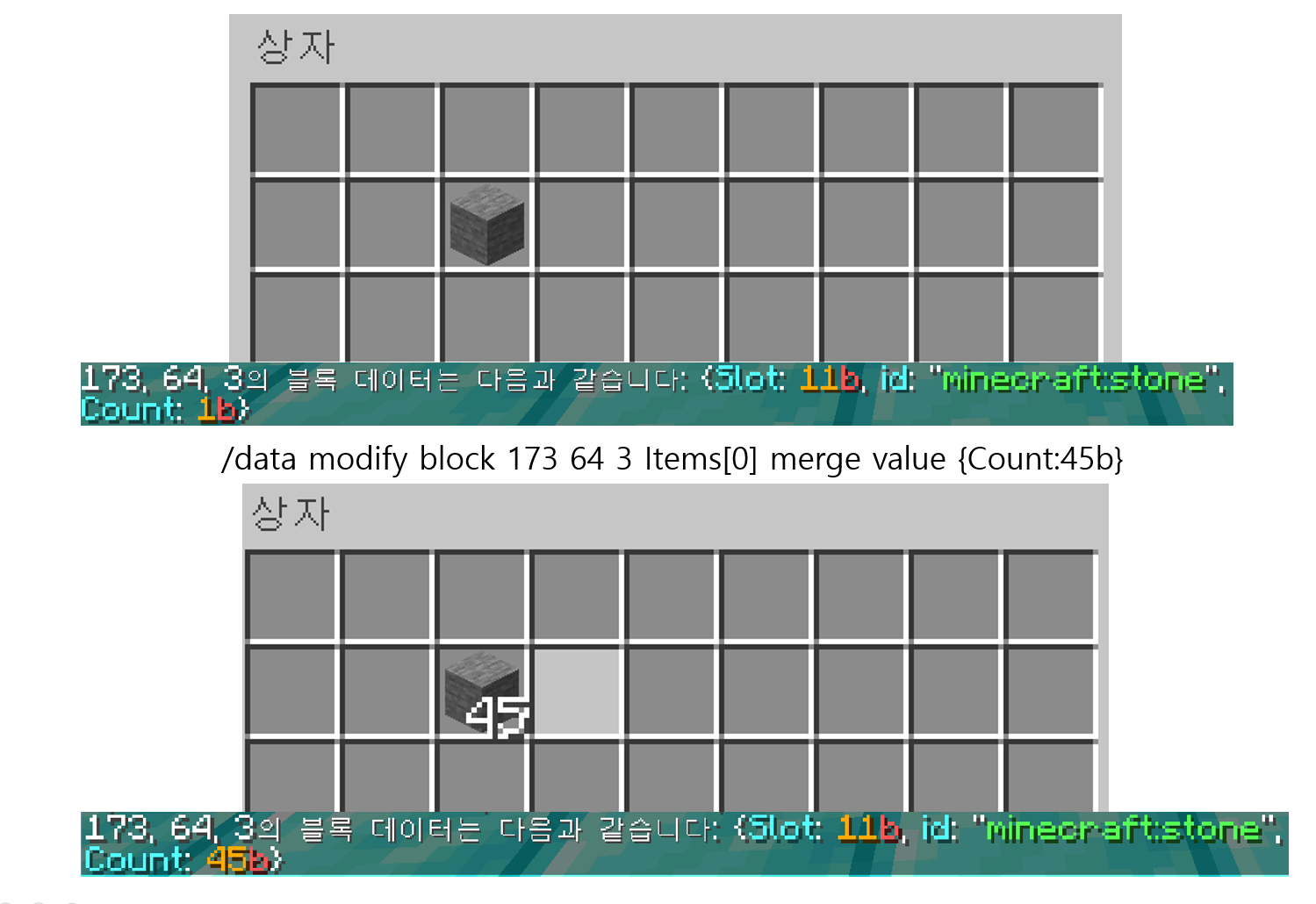 - 예시 : /data modify block 173 64 3 Items[0] merge value {Count:45b}