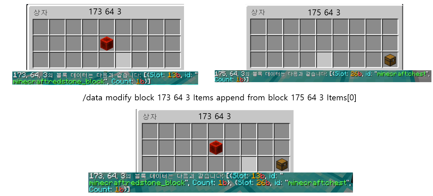 - 예시 : /data modify block 173 64 3 Items append from block 175 64 3 Items[0]