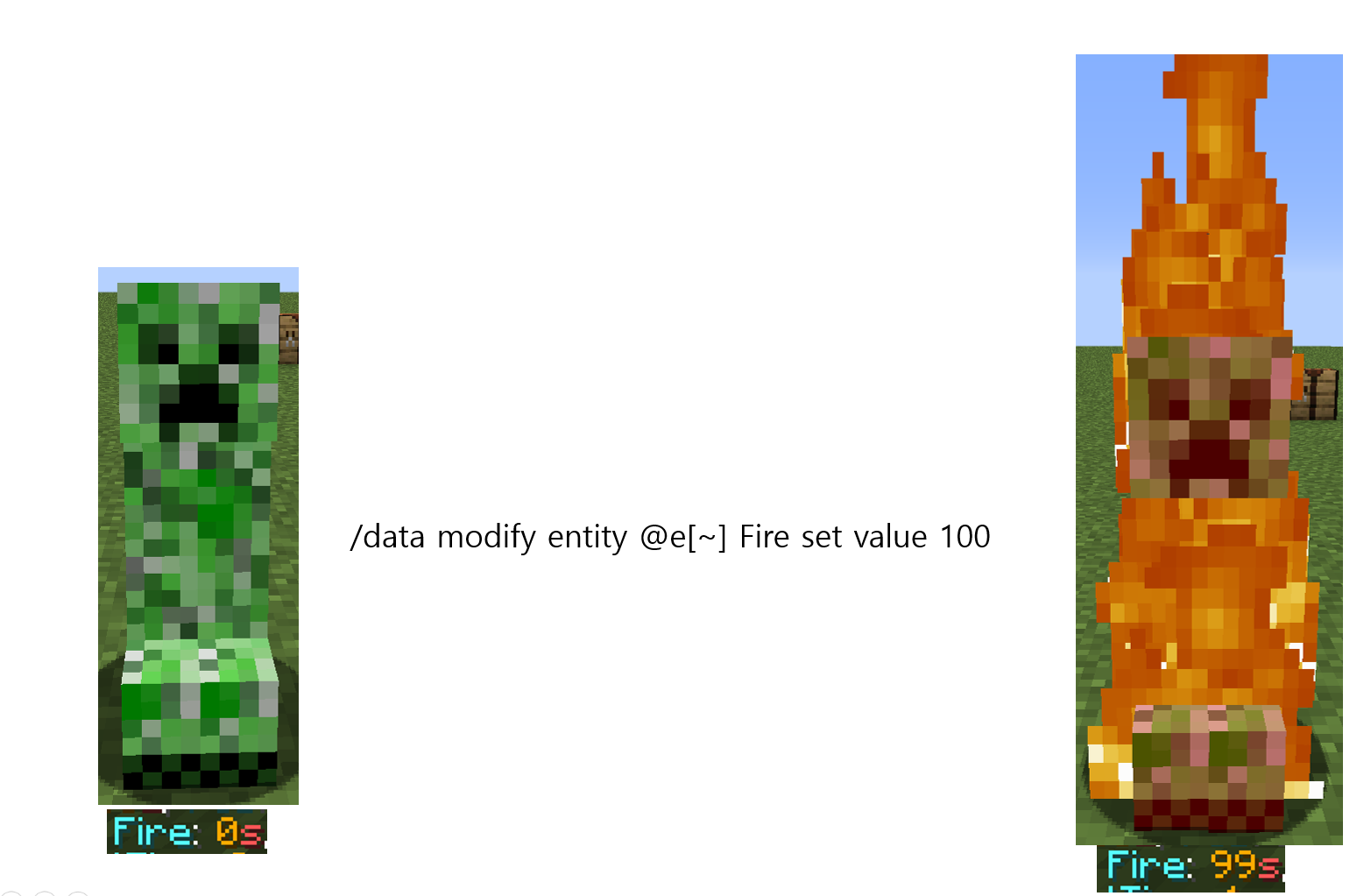 - 예시 : /data modify entity @e[type=minecraft:creeper,limit=1,distance=..2] Fire set value 100