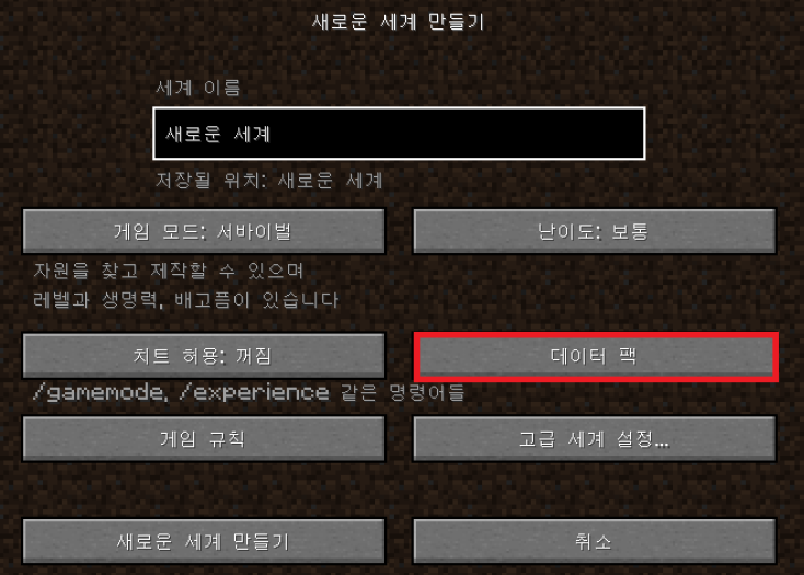 월드를 만들때 데이터팩 버튼이 있습니다.