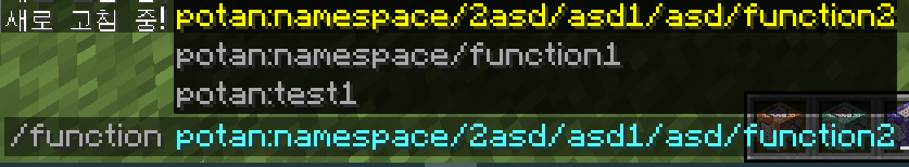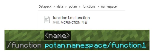 - <함수>의 경우 <네임스페이스:함수이름> 또는 <네임스페이스:네임스페이스/함수이름>처럼 경로가 들어갑니다. 데이터팩의 이름의 경우 들어가지 않습니다.