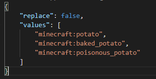 네임스페이스를 minecraft로 설정하고 기본 태그중 바꾸고 싶은 파일을 적어줍시다.