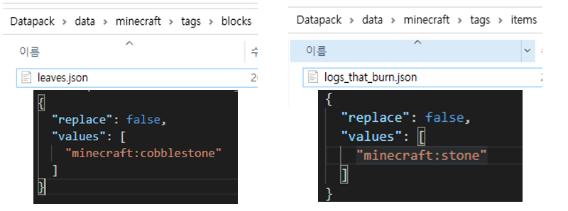 저의 경우 블럭 leaves에 조약돌을 넣고 아이템 logs_that_burn에 돌을 넣었습니다.