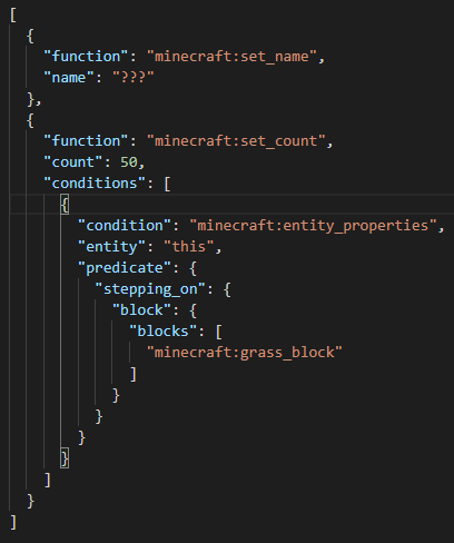 이름을 ???로 설정하는 함수와 대상인 엔티티가 잔디 블록위에 있다면 아이템 개수를 50개로 설정하는 아이템 수정자입니다.