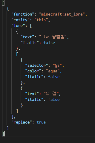 - lore - JSON 텍스트 구성요소 리스트입니다. 한 요소당 lore의 한 줄을 표현합니다.