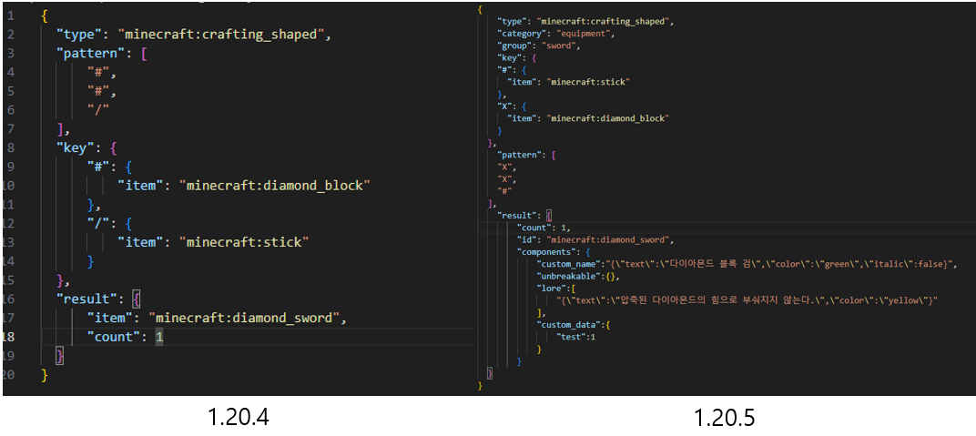result 태그가 변경되었습니다. 기존의 item과 count로 구성되었던 result 태그가 이제 1.20.5에서 새롭게 적용된 아이템 형식을 사용합니다.