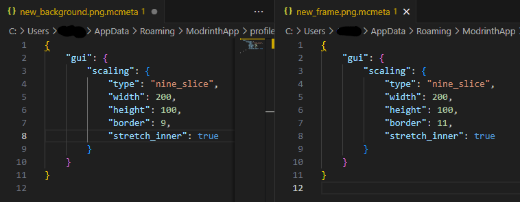frame.png.mcmeta의 경우 이미지에 맞추어 border가 10이라는 것과 inner_stretch가 true라는 점이 다르게 설정되어 있었습니다.