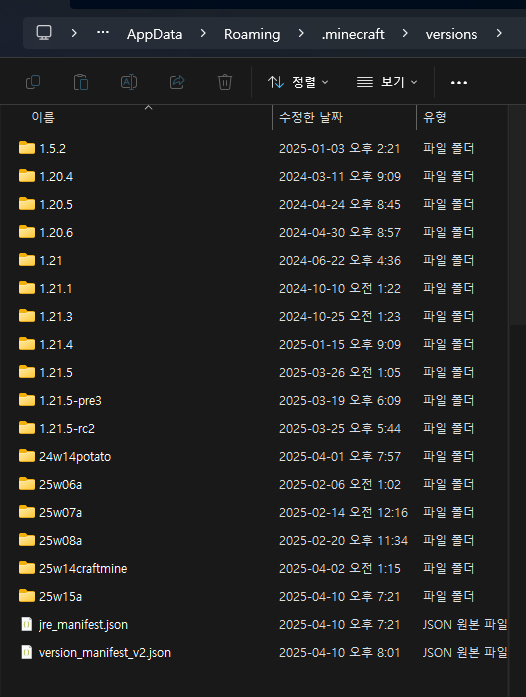 Roaming 폴더의 .minecraft/versions 폴더로 가면 모든 버전들이 존재한다.