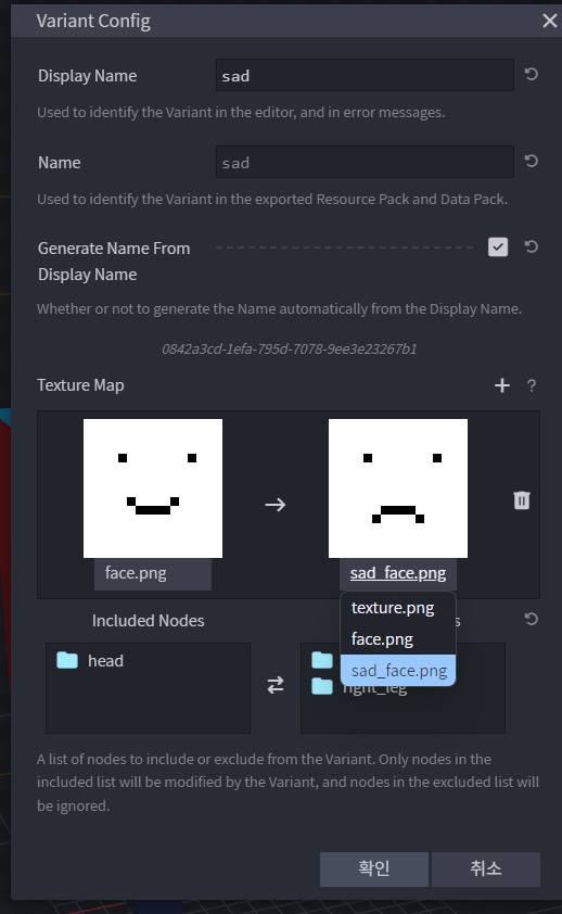 우선 어떤 텍스쳐를 교체할지 생성합니다. 저는 sad 변종일 경우 face -> sad_face로 바뀌도록 할겁니다.